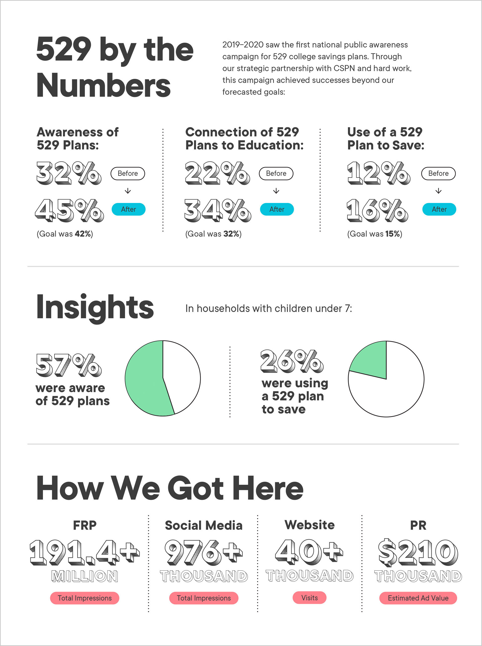 By the time the campaign was over in August of 2020, we had more than exceeded our goals. From our post-campaign survey, we tracked an increase in nationwide 529 awareness by 40%, from 32% to 45% (exceeding our goal of 42%,) and an increase of 529 plan utilization from 12% to 16% (exceeding our goal of 15%). We also ended the campaign with nearly 200 million impressions from our partnership with Fred Rogers Productions and nearly a million impressions from our social media efforts.