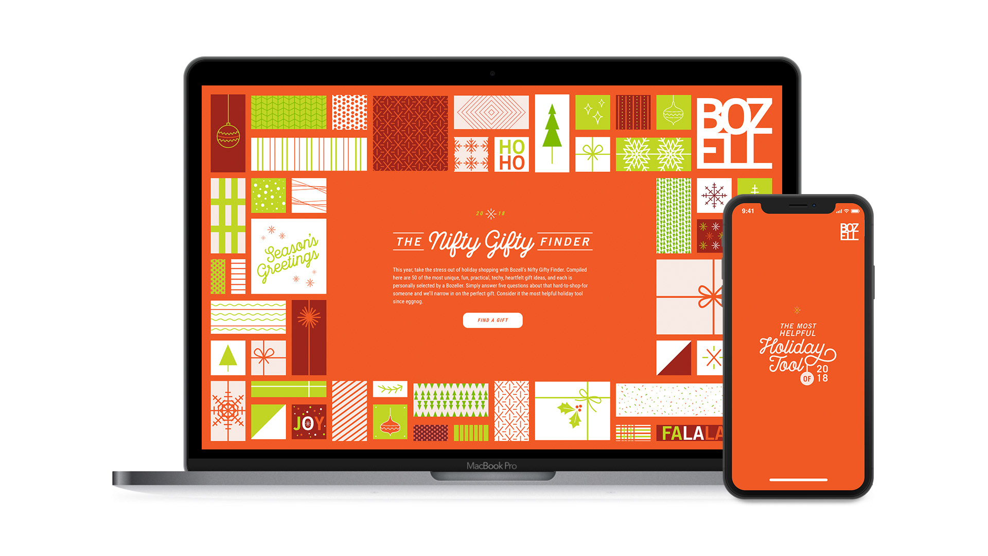 The Nifty Gifty Finder: In lieu of a traditional holiday card in 2018, we created TheNiftyGiftyFinder.com—an online gift idea generator that used five simple questions to help people narrow in on the perfect gift for those hard-to-shop-for someones. The site housed 50 unique gift ideas – some heartfelt, some amusing, but each one specifically selected by a Bozell employee. The site itself was animated throughout the entire gift-elimination process, making it a fun (and helpful) experience from start to finish.