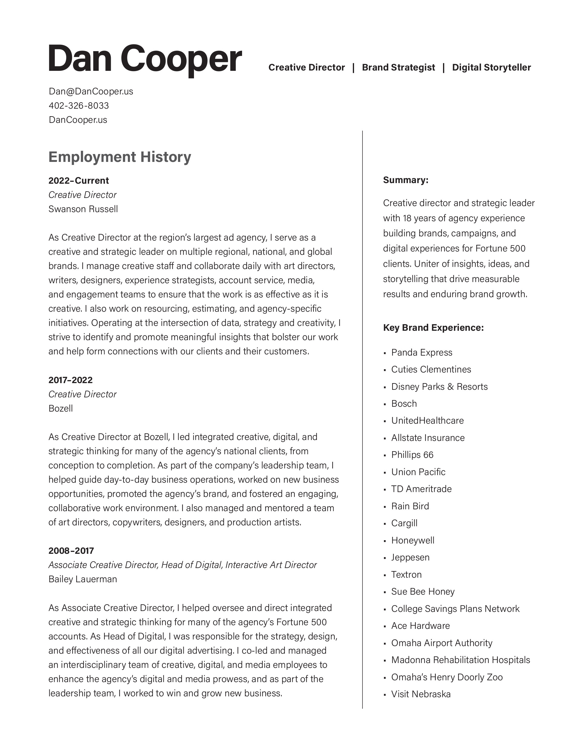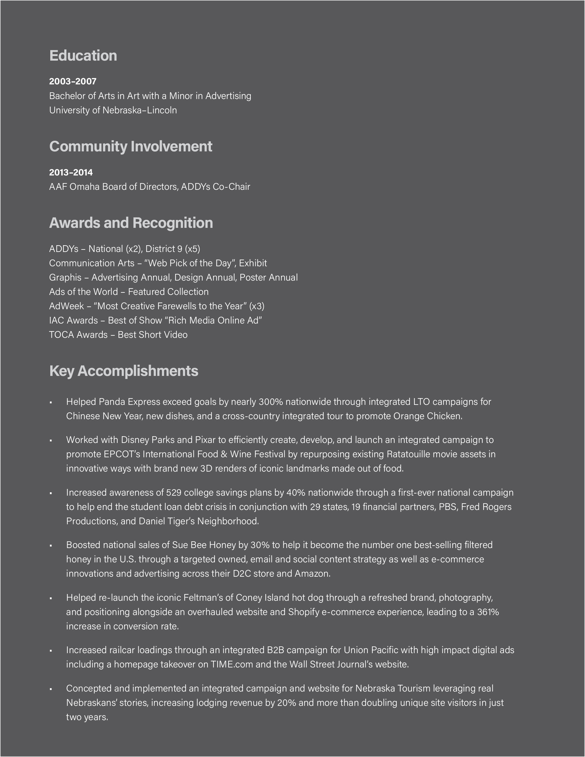 Having served in strategic leadership roles in both digital and traditional creative positions, I’ve gained the ability to make recommendations across channels based on what’s right for the assignment, not just that with which I’m most comfortable. And my experience co-leading a joint media and digital partnership for some of America’s biggest brands means my expertise extends beyond concepting and execution into ensuring that our messaging is reaching the right people at the right time in the right place.